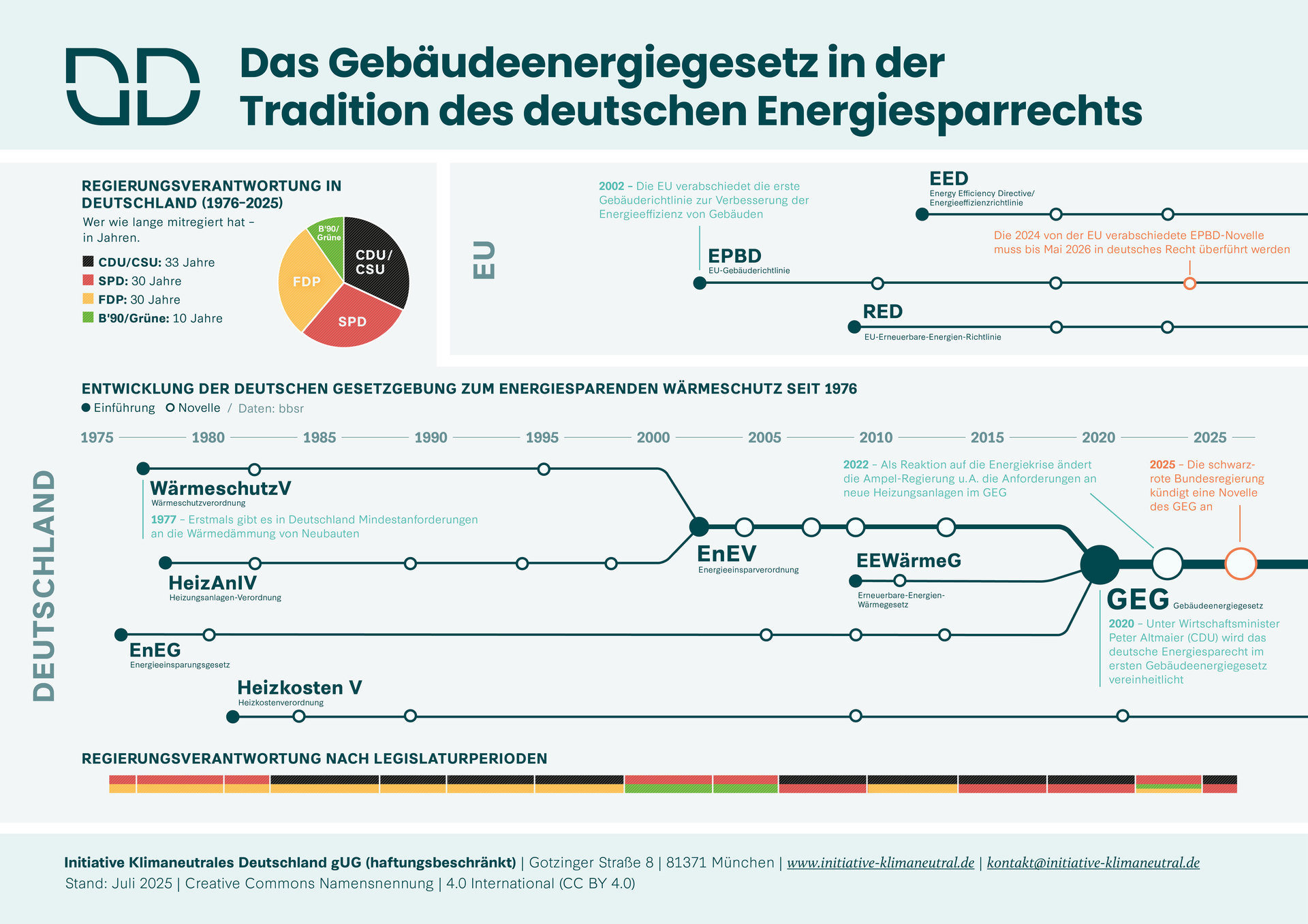 Die Infografik „Das Gebäudeenergiegesetz in der Tradition des deutschen Energiesparrechts“ zeigt, wie Energieeffizienz in Gebäuden im Zuge der Ölkrisen der 1970er Jahren Einzug in Deutschland gehalten hat. Im Jahr 1977 legte eine Wärmeschutzverordnung erstmalig die Energieeffizienz für Gebäude und die Verminderung von Wärmeverlust fest. Entscheidende weitere Neuerungen, wie z.B. das Verbot für mehr als 30 Jahre alte Gasheizkessel geht auf den früheren CDU-Wirtschaftsminister Peter Altmaier zurück.