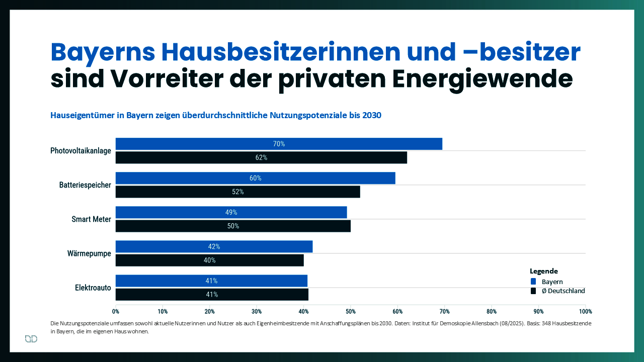 Das gesamte Nutzungspotenzial – aktuelle Nutzerinnen bzw. Nutzer sowie diejenigen, die eine Investition planen – liegt in Bayern bei 88 Prozent bis 2030 und damit höher als im Bundesdurchschnitt (82 Prozent). Bis zu diesem Zeitpunkt könnten 7 von 10 der bayerischen Eigenheimer eine PV-Anlage nutzen und mehr als jeder Dritte eine Wärmepumpe. Bei Solaranlagen ist Bayern bundesweit an der Spitze. Bei Elektroautos liegen Nordrhein-Westfalen und Niedersachsen vorn.