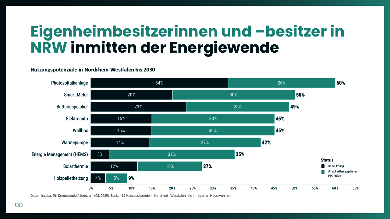 Im Vergleich zur ersten Allensbach-Umfrage im Auftrag der IKND vor einem Jahr bestätigt die aktuelle Studie: Die Nutzungs- und Anschaffungspläne der Eigenheimbesitzerinnen und -besitzer sind stabil, sowohl im bundesweiten Vergleich als auch in Nordrhein-Westfalen. Trotz des Endes der Ampelkoalition sowie der zahlreichen Änderungen in der Energie- und Verkehrspolitik, die Schwarz-Rot ankündigt hat, sind die Menschen weiter bereit, privat in klimafreundliche Technologien zu investieren. Dies gilt auch in Nordrhein-Westfalen, wo seit drei Jahren eine schwarz-grüne Koalition regiert.