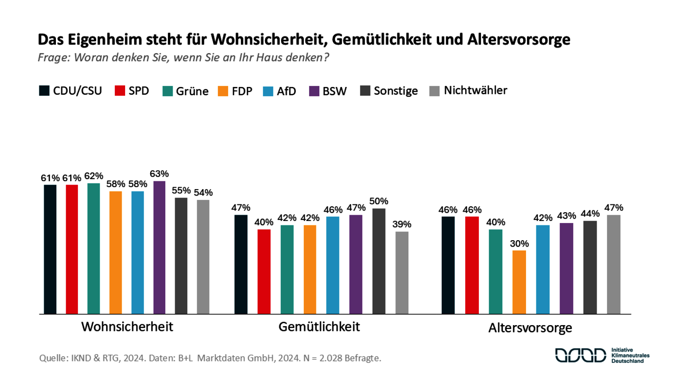 Die Umfrage zeigt auch, dass die politisch ausgelöste Verunsicherung auch das subjektive Sicherheitsgefühl der Hauseigentümer gefährden kann. Denn mit ihrem Eigenheim verbinden Eigenheimbesitzer in der Regel mehr als nur Immobilienbesitz. Bei rund 60 Prozent der Befragten steht das das eigene Heim auch für Wohnsicherheit. Dieser Wert ist weitgehend unabhängig von der Parteipräferenz. Zudem denken jeweils rund 40 Prozent der Befragten bei ihrem Haus auch an „Gemütlichkeit“ und „Altersvorsorge“.