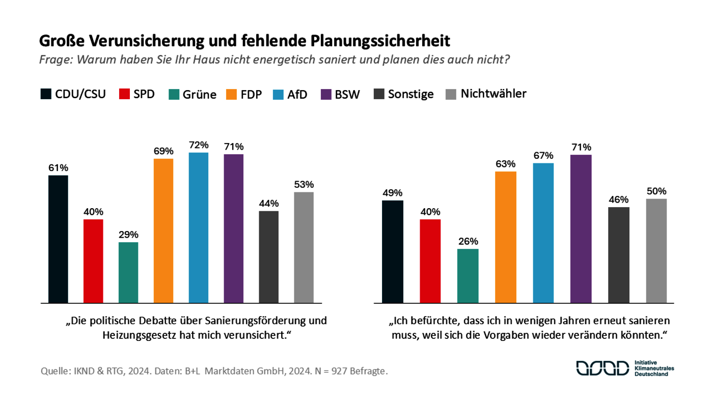 Insbesondere vermissen die Eigenheimbesitzer verlässliche Rahmenbedingungen für die energetische Sanierung – also Maßnahmen wie der Heizungstausch, die Fenstermodernisierung oder die Dämmung. So geben mehr als 50 Prozent der Befragten an, bisher nicht saniert zu haben, weil sie aufgrund der politischen Debatte über die Sanierungsförderung und das als „Heizungsgesetz“ bezeichnete Gebäudeenergiegesetz verunsichert seien. Besonders ausgeprägt ist die Verunsicherung unter Wählern der CDU/CSU mit einer Quote von 61 Prozent und der FDP mit 69 Prozent. Gleichzeitig befürchtet die Hälfte der Befragten, dass sich binnen weniger Jahre die Anforderungen an Sanierungen erneut verändern werden, was den Modernisierungseifer stark bremst. „Das sind schlechte Neuigkeiten, denn der Hausbestand in Deutschland überaltert derzeit immer mehr. Um Klimaziele und Vorgaben der EU zu erreichen, müssten jährlich mindestens 2 Prozent der deutschen Wohnhäuser saniert werden, wir liegen aber aktuell bei weniger als 1 Prozent“, sagt Carolin Friedemann, Gründerin und Geschäftsführerin der Initiative Klimaneutrales Deutschland.