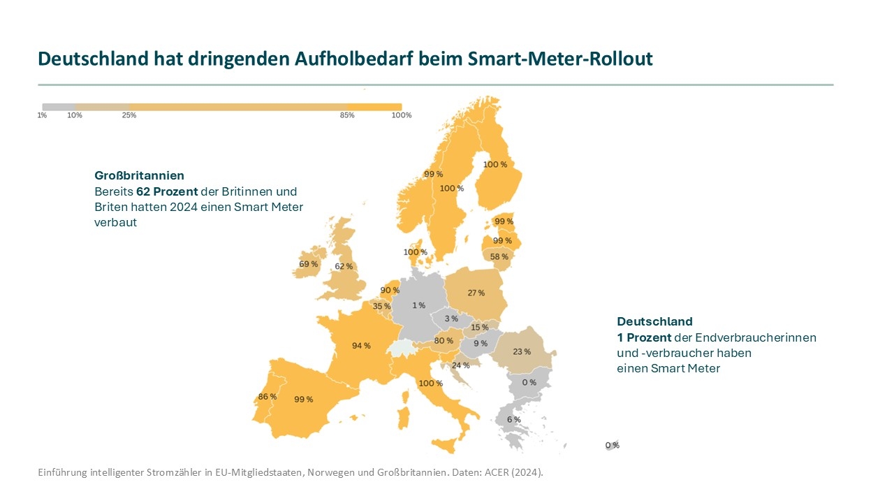 Ein wichtiger Grund für die Ersparnisse in Großbritannien gegenüber Deutschland ist der signifikante Vorsprung bei Smart Metern und die damit verbundene Verfügbarkeit von günstigen Nachtstromtarifen. 62 Prozent der Britinnen und Briten hatten 2024 einen Smart Meter verbaut, in Deutschland waren es im selben Jahr nur ein Prozent. Das hat zur Folge, dass dynamische Tarife hierzulande kaum verfügbar sind, da ein Smart Meter fast immer die Voraussetzung dafür ist. Er erfasst den Stromverbrauch in 15-Minuten-Intervallen und übermittelt die Daten an den Anbieter, um die Kosten direkt an die stündlichen Börsenpreise zu koppeln und so das Sparen durch das Verschieben von Verbräuchen zu ermöglichen. Nur 7 Prozent der deutschen Haushalte nutzte 2024 einen flexiblen Stromtarif.