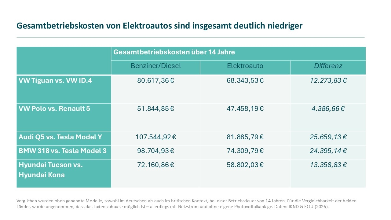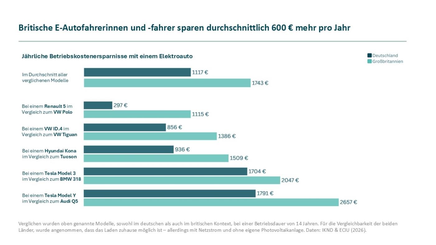 Die Sparpotenziale bei einem Elektroauto gegenüber einem Auto mit Verbrennungsmotor sind sowohl in Deutschland als auch in Großbritannien erheblich. Dies zeigt der Vergleich der Gesamtbetriebskosten mehrerer Automodelle. Verglichen wurden folgende Modelle, sowohl im deutschen als auch im britischen Kontext (das erst genannte Modell jeweils mit Verbrennungsmotor): VW Tiguan mit VW ID.4, VW Polo mit Renault 5, Audi Q5 mit Tesla Model Y, BMW 318 mit Tesla Model 3, Hyundai Tucson mit Hyundai Kona. Bei der Auswahl der Modelle wurde auf eine ähnliche Größe und Leistung der Fahrzeuge geachtet sowie deren Beliebtheit in beiden Märkten.