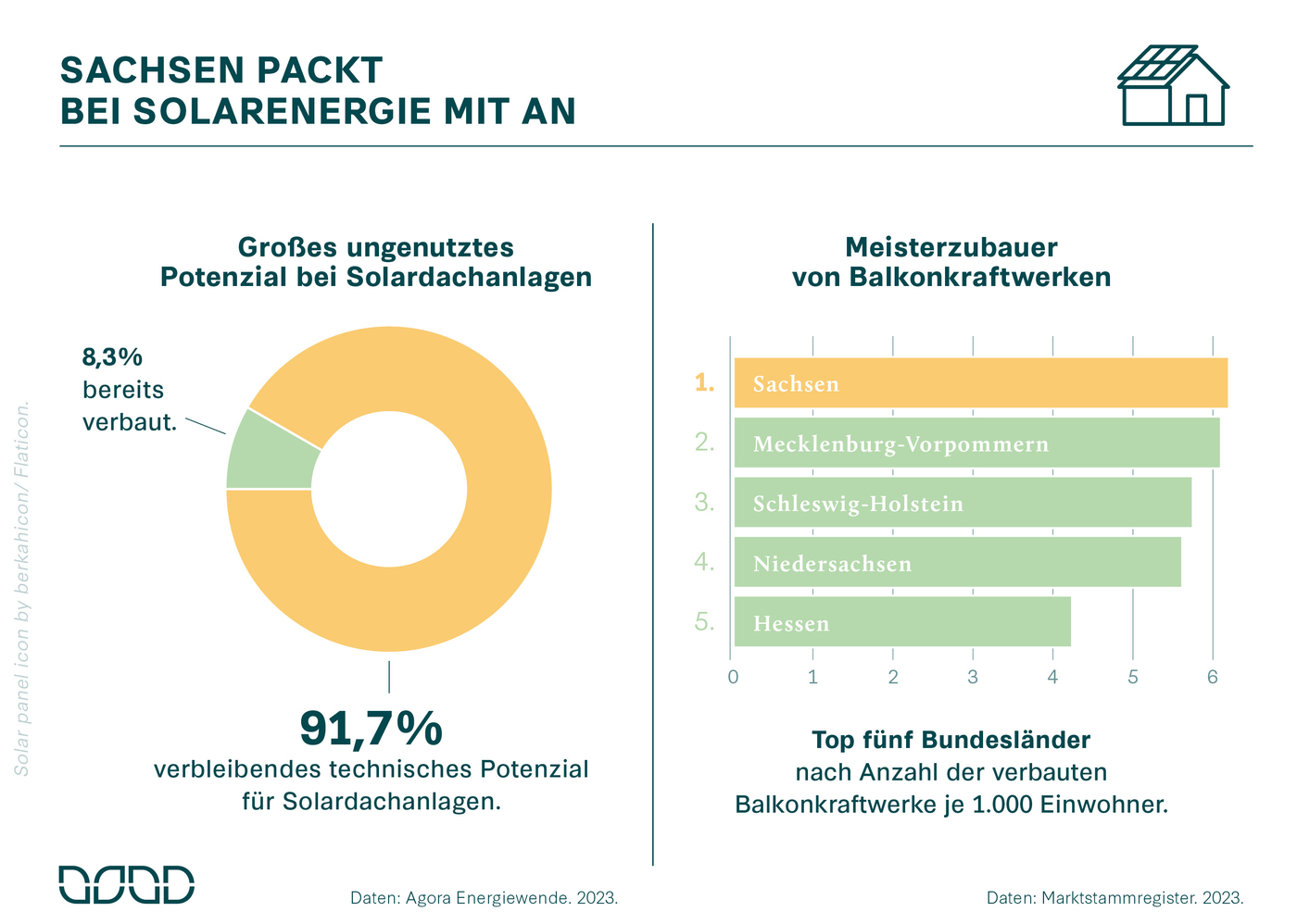 In keinem anderen Bundesland wurden so viele Balkonkraftwerke zugebaut wie im Freistaat. Mit mehr als fünf Anlagen je 1.000 Einwohner liegt Sachsen weit über dem deutschlandweiten Durchschnitt, der bei 3,24 liegt. Auch bei Solarstrom vom Dach ist das Potenzial in Sachsen groß – 91,7 Prozent der technisch geeigneten Dachfläche ist noch für die Freiheitsenergie verfügbar.