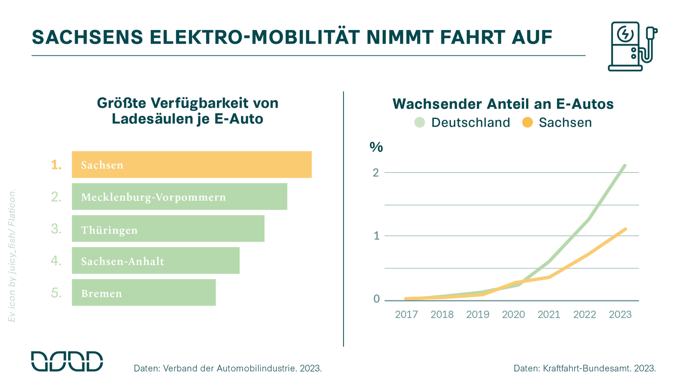 Im Bundesländervergleich bietet Sachsen seinen Autofahrern die meisten Ladesäulen pro E-Auto. Gleichzeitig hat der Freistaat aber die geringste Anzahl an E-Autos je Einwohner. Im Jahr 2023 lag der Anteil an E-Autos bei etwas mehr als einem Prozent. Auf Herstellerseite zeichnet sich jedoch eine Wende ab: 2024 sollen in Sachsen zumindest mehr E-Autos als konventionelle Verbrenner gebaut werden.