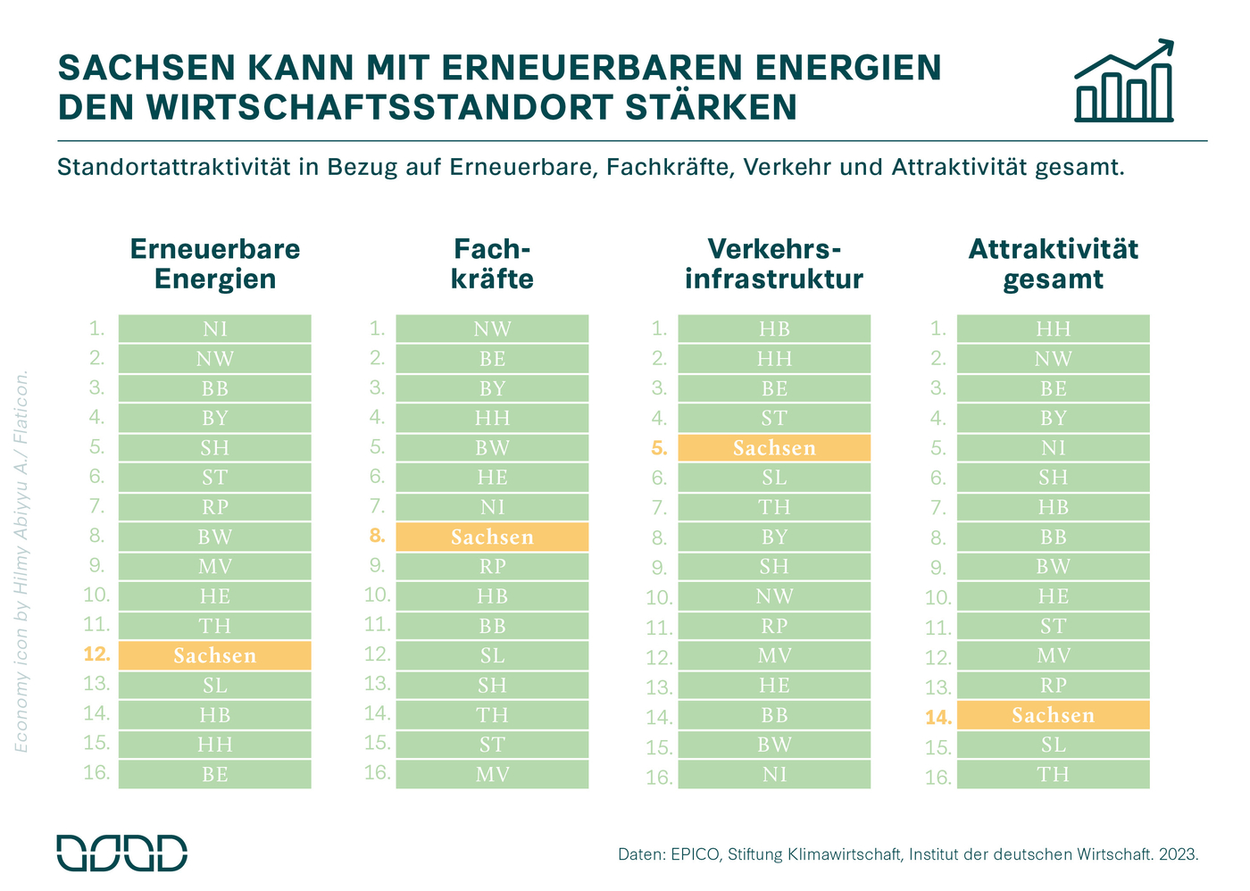 Während Sachsens Standortattraktivität hinsichtlich der Verfügbarkeit geeigneter Fachkräfte und dem Anschluss an Verkehrsinfrastrukturen von Unternehmen sehr gut bewertet wird, bildet der Freistaat gemeinsam mit dem Saarland und den Stadtstaaten bei der Verfügbarkeit erneuerbarer Energie vor Ort das Schlusslicht. Das macht sich auch in der Gesamtbewertung des Wirtschaftsstandorts bemerkbar, in der Sachsen im Bundesländervergleich Platz 14 belegt. Das zeigt: Sachsen könnte mit den erneuerbaren Energien seine Standortattraktivität bedeutend verbessern.