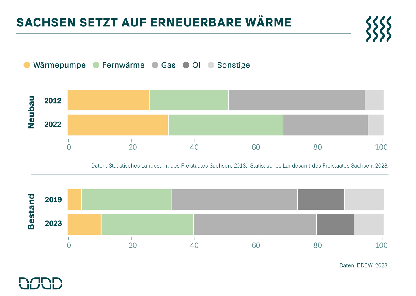 Mehr als zwei Drittel der Einwohnerinnen und Einwohner Sachsens entscheidet sich beim Hausbau bereits für erneuerbare Wärmeerzeugung. Auch im Bestand ist der Anteil an Wärmepumpen und Fernwärme 2023 auf 40 Prozent angestiegen. Sachsen hat zudem bundesweit den höchsten Anteil an Immobilien der zwei besten Energieeffizienzklassen A+ und A.