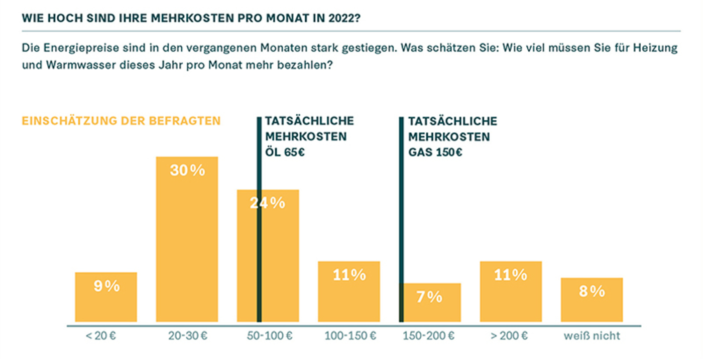 Insbesondere der Anstieg von Heizkosten ist seit mehreren Monaten immer wieder Gegenstand der politischen Debatte. Auch in den Medien wird das Thema nach wie vor behandelt, u.a. mit konkreten Zahlen, welche Mehrkosten auf die Privathaushalte Laufe des Jahres zukommen. Daher haben wir die Umfrageteilnehmenden gebeten, ihre monatlichen Mehrkosten für Heizung und Warmwasser zu schätzen.