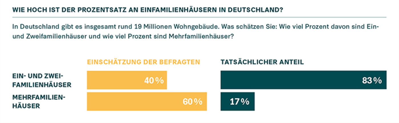 In der Umfrage wurden die Hauseigentümer zudem gebeten, die Verteilung der Wohngebäude in Deutschland auf Ein- und Zweifamilienhäuser und Mehrfamilienhäuser zu schätzen. Wahrnehmung und Realität liegen hier deutlich auseinander, wie die folgende Abbildung zeigt. Im Durchschnitt schätzen die Befragten den Anteil von Ein- und Zweifamilienhäusern auf rund 42 Prozent, tatsächlich liegt der Anteil doppelt so hoch. Rund 80 Prozent der Ein-und Zweifamilienhauser werden von den Eigentümern selbst bewohnt.