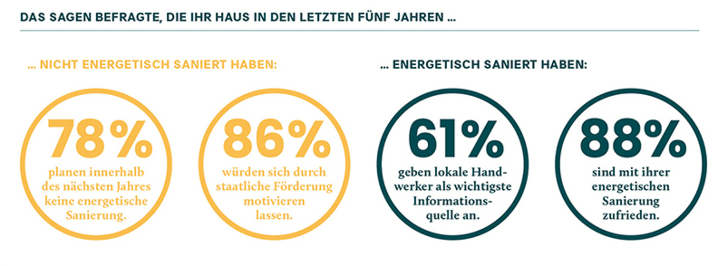 Bei der Gruppe der Eigentümer, die in den letzten fünf Jahren eine Sanierung durchgeführt haben oder aktuell dabei sind, waren bzw. sind Handwerker die wichtigste Informationsquelle. Insgesamt zeichnet sich eine große Zufriedenheit mit der Sanierung ab. Insgesamt sind die befragten Sanierer mit ihrer energetischen Sanierung zufrieden: 88 Prozent sagen, die Ergebnisse haben ihre Erwartungen erfüllt und 73 Prozent würden nocheinmal Maßnahmen zur energetischen Sanierung umsetzen.