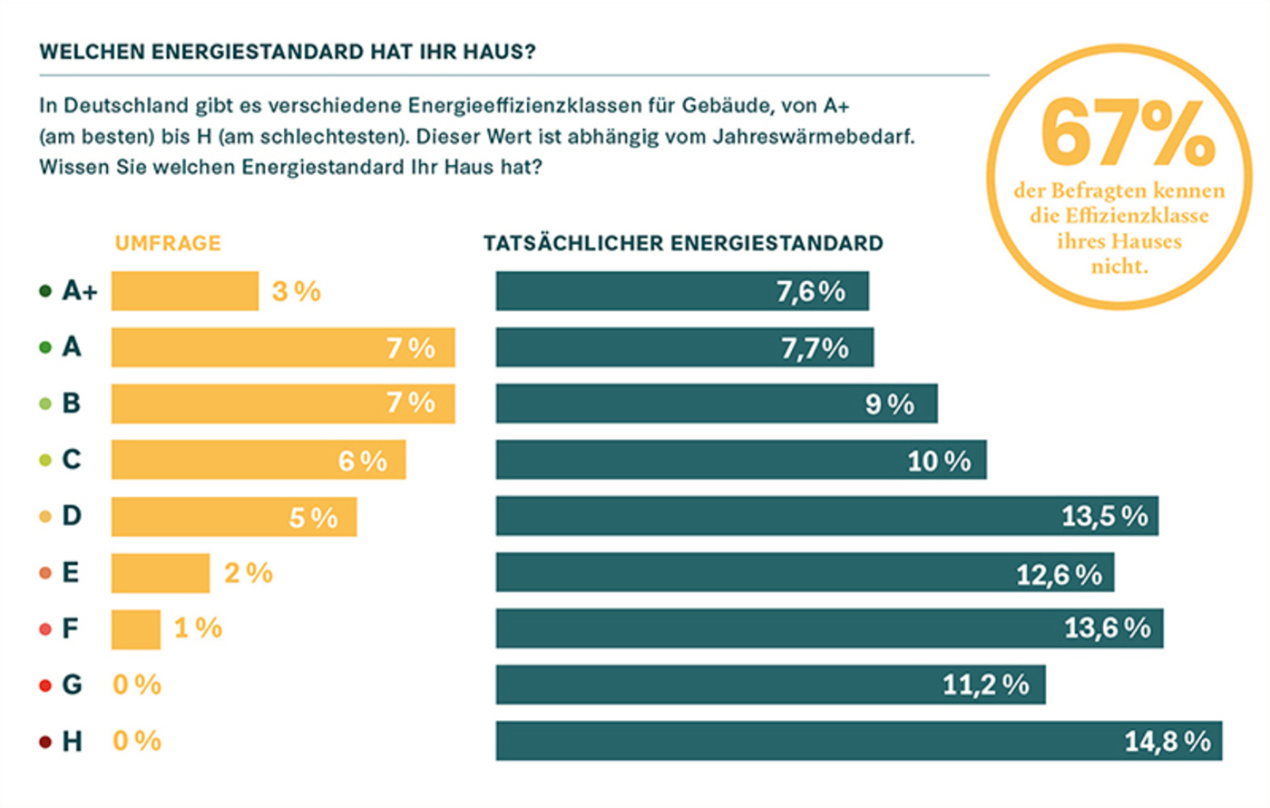 Dennoch kennen zwei Drittel der befragten Eigentümer den Energiestandard ihres Hauses nicht. Auch eine YouGov-Umfrage aus dem Oktober 2021 unter Immobilieneigentümern, darunter auch Mehrfamilienhäuser, zeigt: nur jeder vierte Hausbesitzer kennt die Energieeffizienzklasse der eigenen Immobilie.