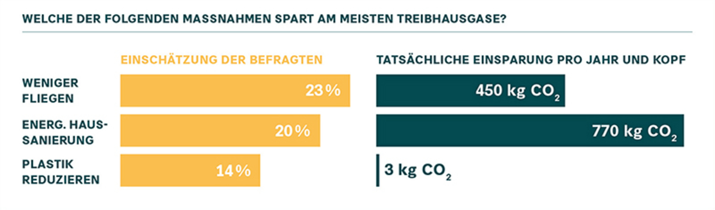 Bei der Frage, welche der weitläufig bekannten Maßnahmen insgesamt am meisten Treibhausgase einsparen könnten, erreicht die energetische Gebäudesanierung immerhin Platz 2. Tatsächlich ist sie unter den Top drei Antworten aber die effektivste Maßnahme, um Treibhausgase einzusparen.