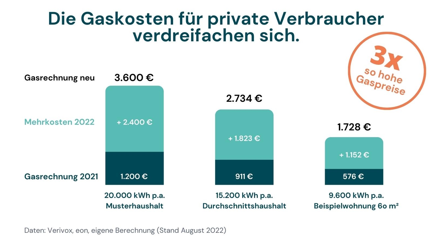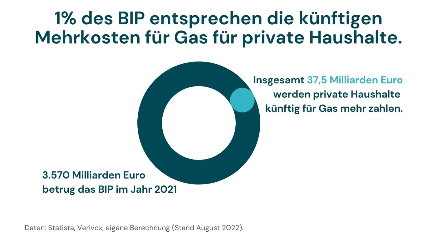 Hohe Preise sind ein wichtiges Signal an alle Gaskunden, ihren Verbrauch zu senken. Das betrifft Industrie wie auch private Haushalte. Während es für die Industrie teilweise finanzielle Hilfen gibt, stehen private Haushalte vor großen finanziellen Belastungen. Besonders betroffen sind Haushalte mit niedrigen und mittleren Einkommen. In welchen Dimensionen sich diese Mehrkosten bewegen, zeigen die nachfolgenden Grafiken.