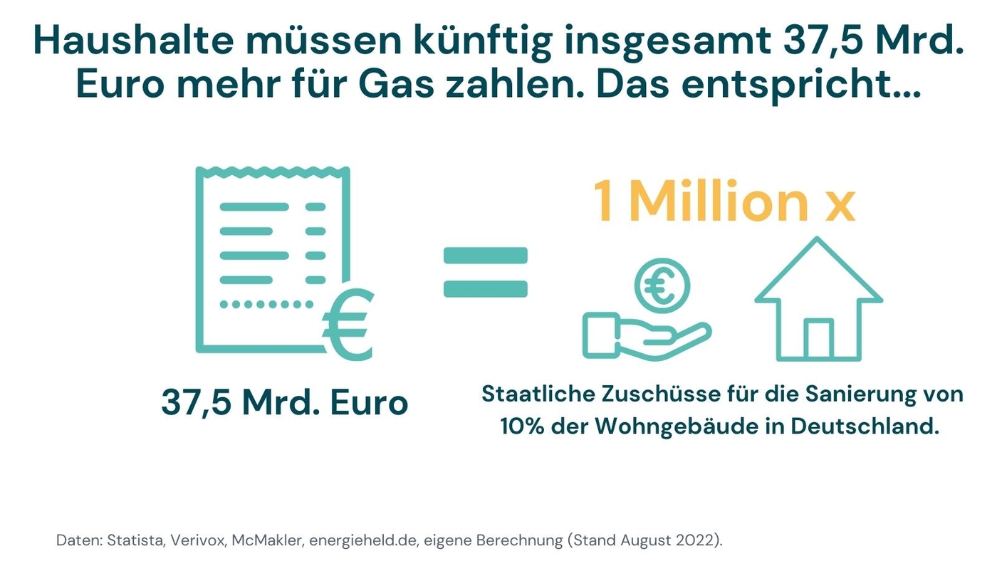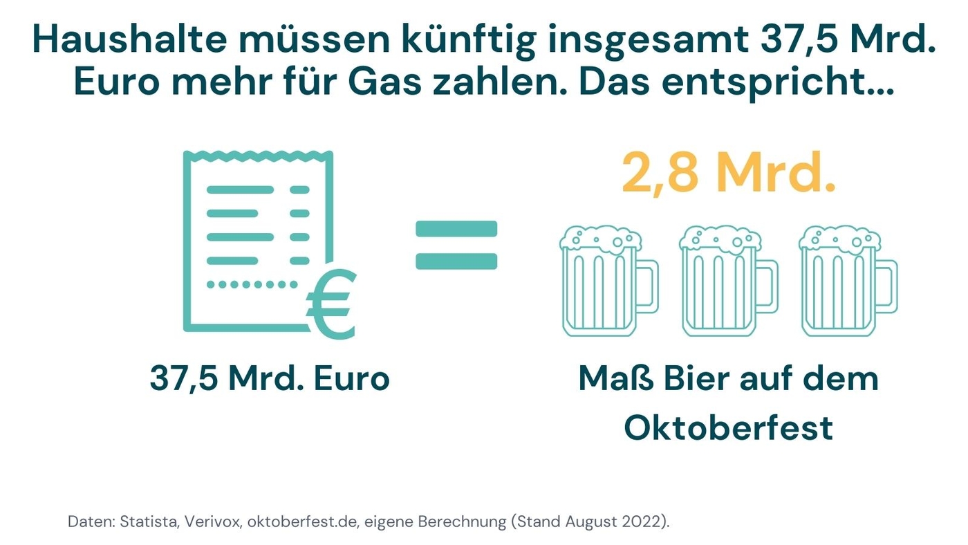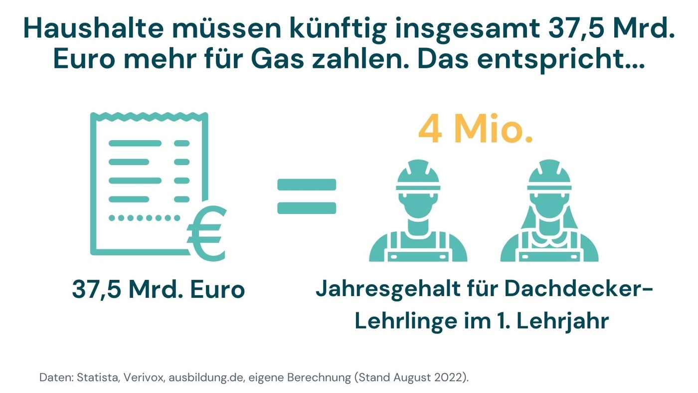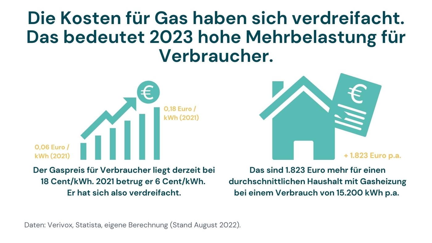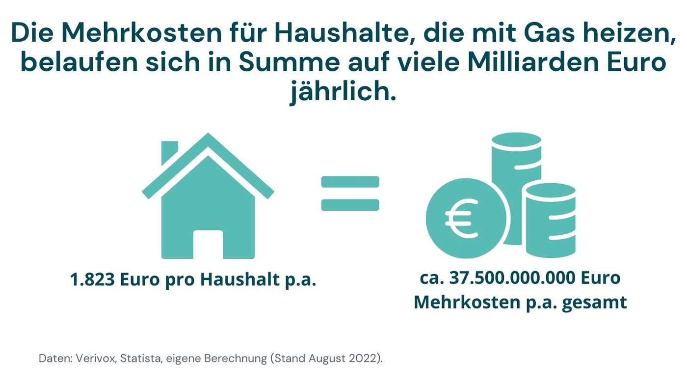 Die Hälfte aller Haushalte in Deutschland heizt mit Gas, das sind 21 Millionen. Im Durchschnitt fallen 1.823 Euro zusätzliche Kosten für einen Durchschnittshaushalt für 2022/23 an.