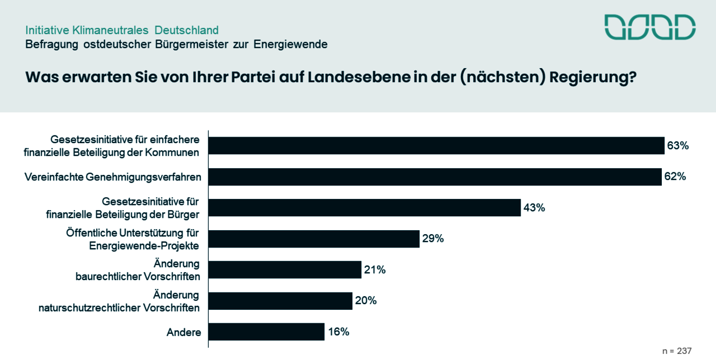 Von der Landesregierung erwarten sie eine einfachere finanzielle Beteiligung der Kommunen (63 Prozent) und vereinfachte Genehmigungsverfahren (62 Prozent). Dies signalisiert den höheren Politikebenen, sich stärker hinter die Energiewende zu stellen, um die Umsetzung vor Ort zu erleichtern.
