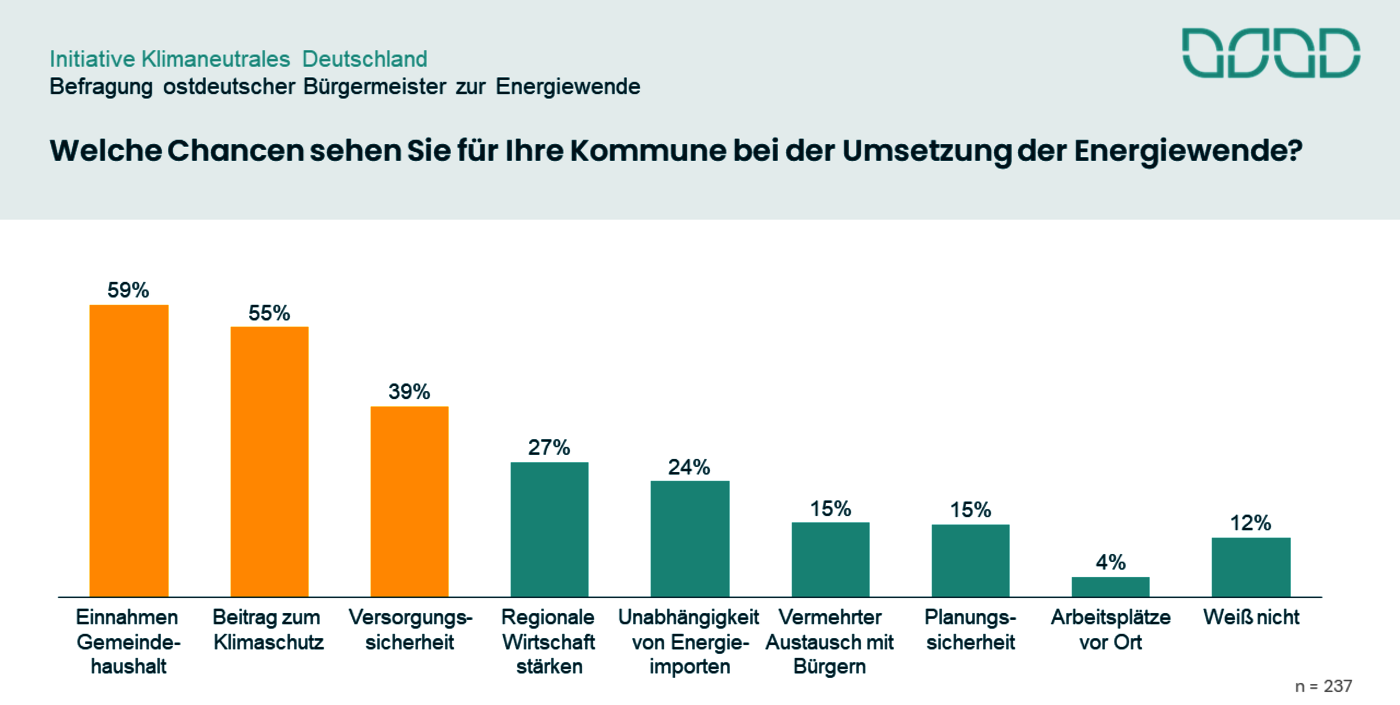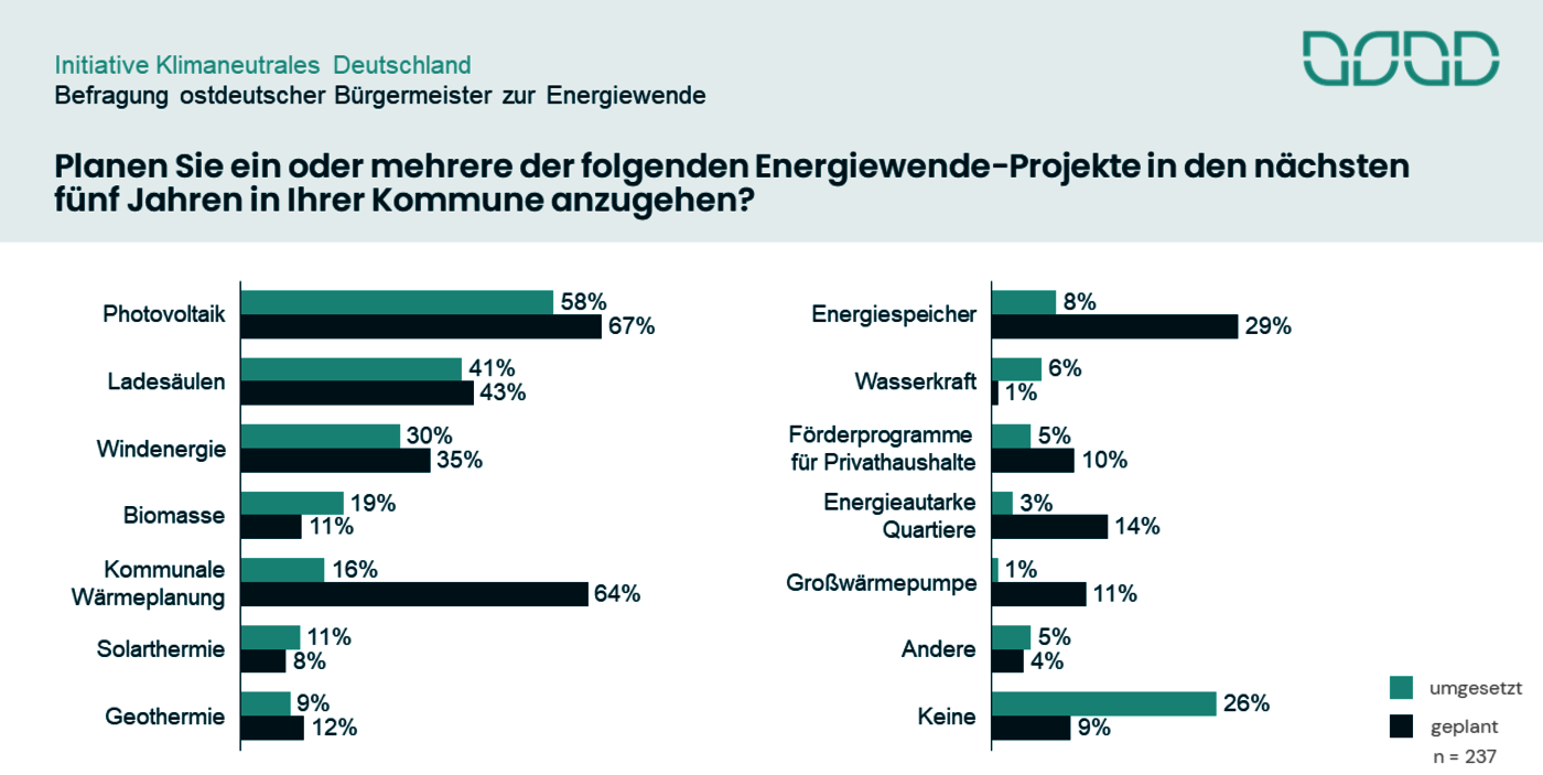 Bürgermeister im Osten von Deutschland sind aktiv an der Energiewende beteiligt und setzen sich für die Transformation ihrer Kommunen ein. 9 von 10 Kommunen planen in den nächsten fünf Jahren die Umsetzung von Energiewende-Projekten umzusetzen.