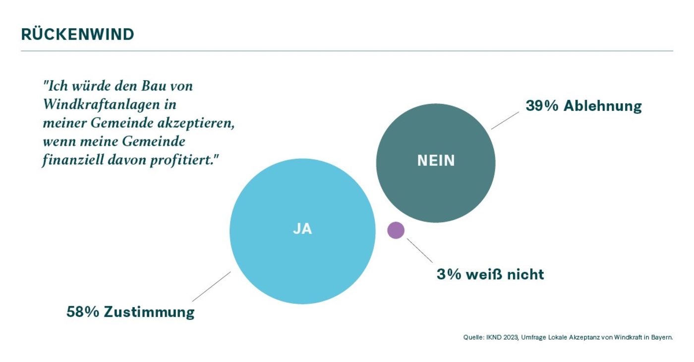 In einer von der Initiative Klimaneutrales Deutschland (IKND) beauftragten Umfrage geben sechs von zehn befragten Personen in Bayern an, dass sie den Bau von Windkraftanlagen in ihrer Gemeinde akzeptieren, wenn diese finanziell davon profitieren würde.