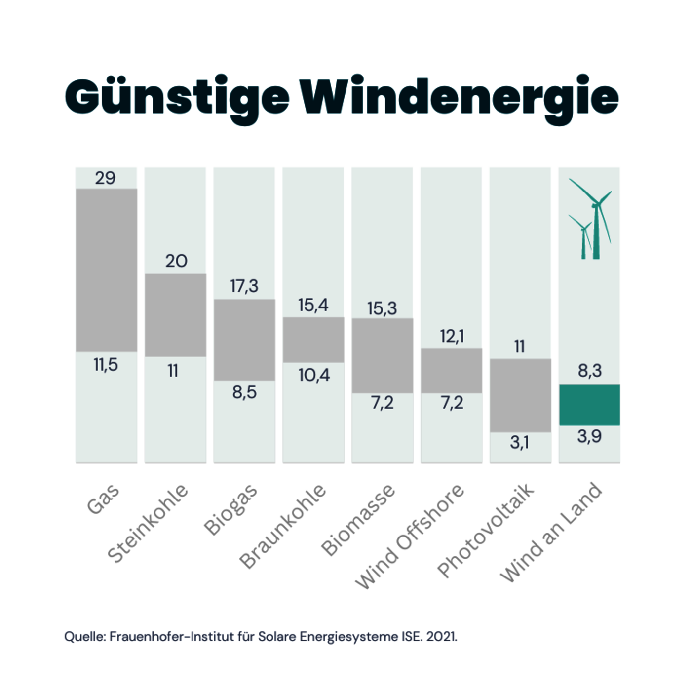 Windenergie an Land ist die günstigste Technologie zur Stromerzeugung in Deutschland – mit deutlichem Abstand zu Kraftwerken, die mit fossilen Energieträgern wie Kohle- und Gas betrieben werden. Anders als fossile Energieträger, die aufwendig abgebaut und gefördert werden müssen, ist der Energieträger Wind kostenlos und unbegrenzt verfügbar. Zukünftig wird Strom aus erneuerbaren Energien noch günstiger. Das Frauenhofer-Institut für Solare Energiesysteme ISE prognostiziert, dass Photovoltaik- und Windenergieanlagen bis zum Jahr 2040 die durchschnittlichen Kosten für die Stromerzeugung aller fossilen Kraftwerke deutlich unterbieten.