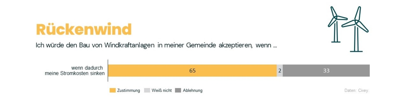 In einer von der Initiative Klimaneutrales Deutschland (IKND) beauftragten aktuellen Civey-Umfrage geben zwei Drittel der befragten Bayern an, dass sie den Bau von Windkraftanlagen in ihrer Gemeinde akzeptieren, wenn dadurch ihre Stromkosten sinken.
